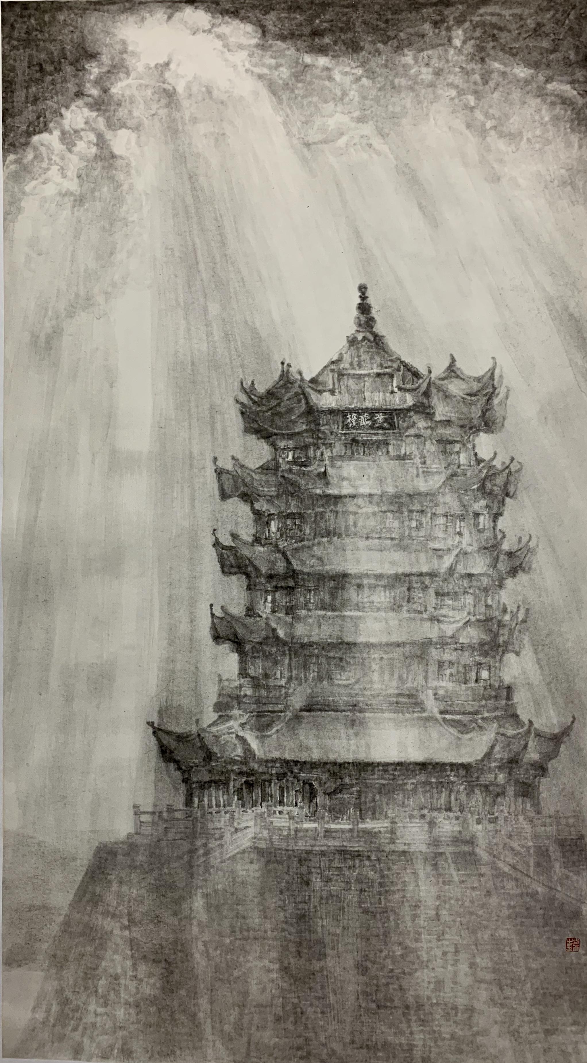 通过一个星期左右的资料收集,毛冬华画出了水笔草图和两张水墨草图,最后确定以黄鹤楼为创作切入点。