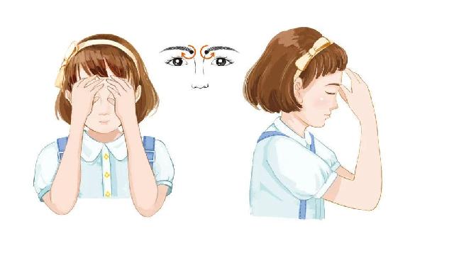 用双手大拇指螺纹面分别按于两侧穴位上;其余四指自然放松、弯曲,指尖抵在前额上。