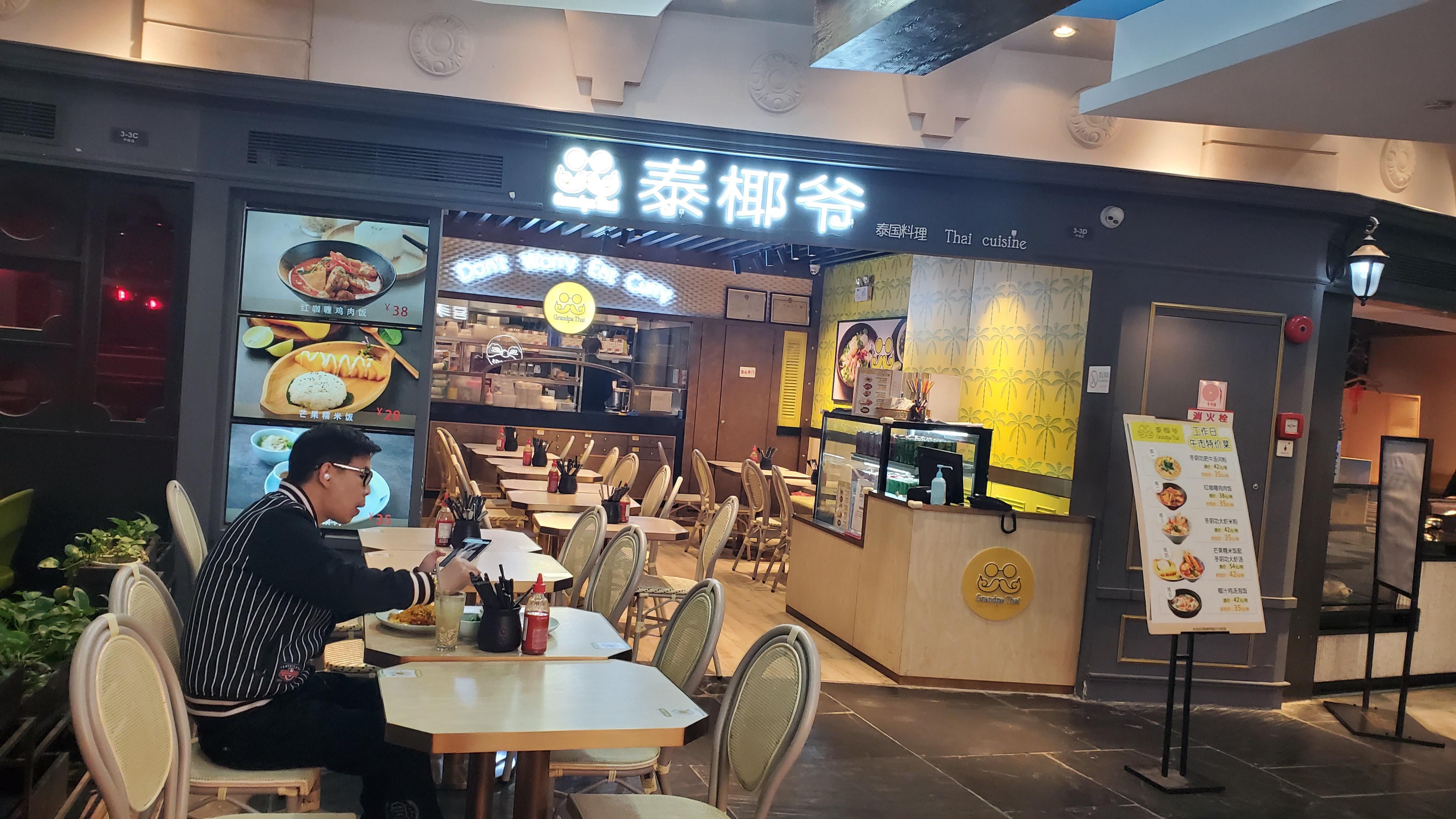 记者随后来到一家泰国风味快餐店。该店主要提供各种泰式小吃。就像美罗城其他的餐饮店一样,这家泰式小吃店内也是冷冷清清,店门外坐了一位男子,独自一人拿下口罩吃着饭。也许是怕空气闭塞,他选择在店外的桌位进食。
