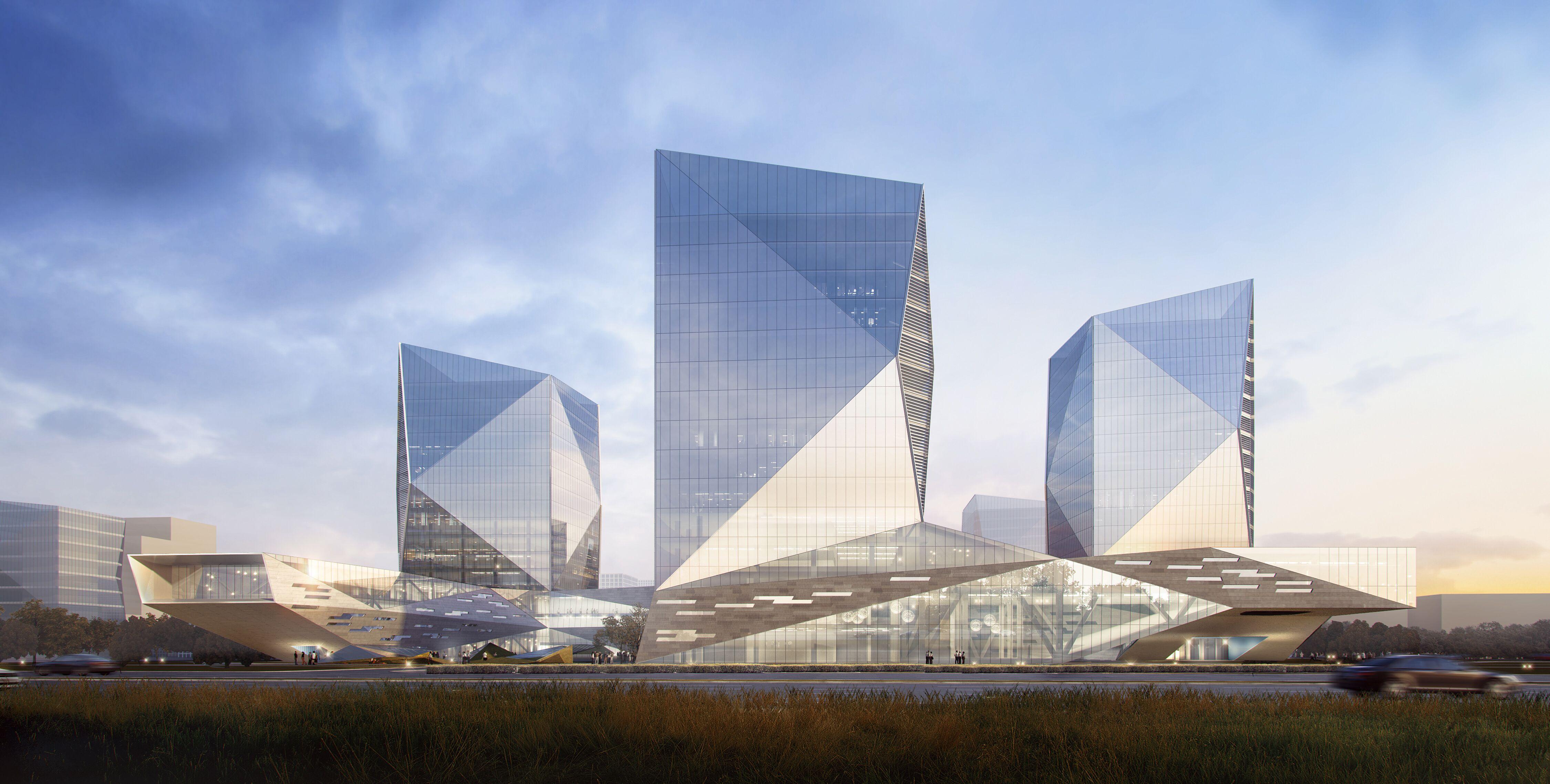 张军烈还披露说,三栋塔楼共计48个倾斜面,裙楼部位有将近60多个角度不同的三角面折线拼接,这正是造就“晶体”形象的关键,也成为了施工的难点。