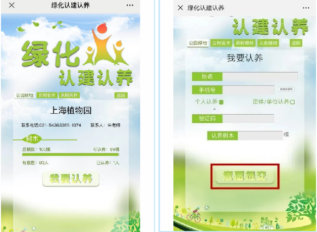 在“绿色上海”的子菜单界面中,点击“义务植树”,你就可以在线认养或进行绿化捐款来看看具体怎么操作的👇👇👇