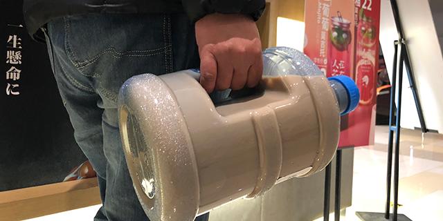 记者看到,奶茶桶的盖子上有一个开孔,顾客可以直接将奶茶倒出,奶茶桶的侧面还自带一个把手,想要一只手将它举起来,还挺不容易,龙女士用两手抱起奶茶桶试了一下重量后, 就赶忙递给了身边的同事。