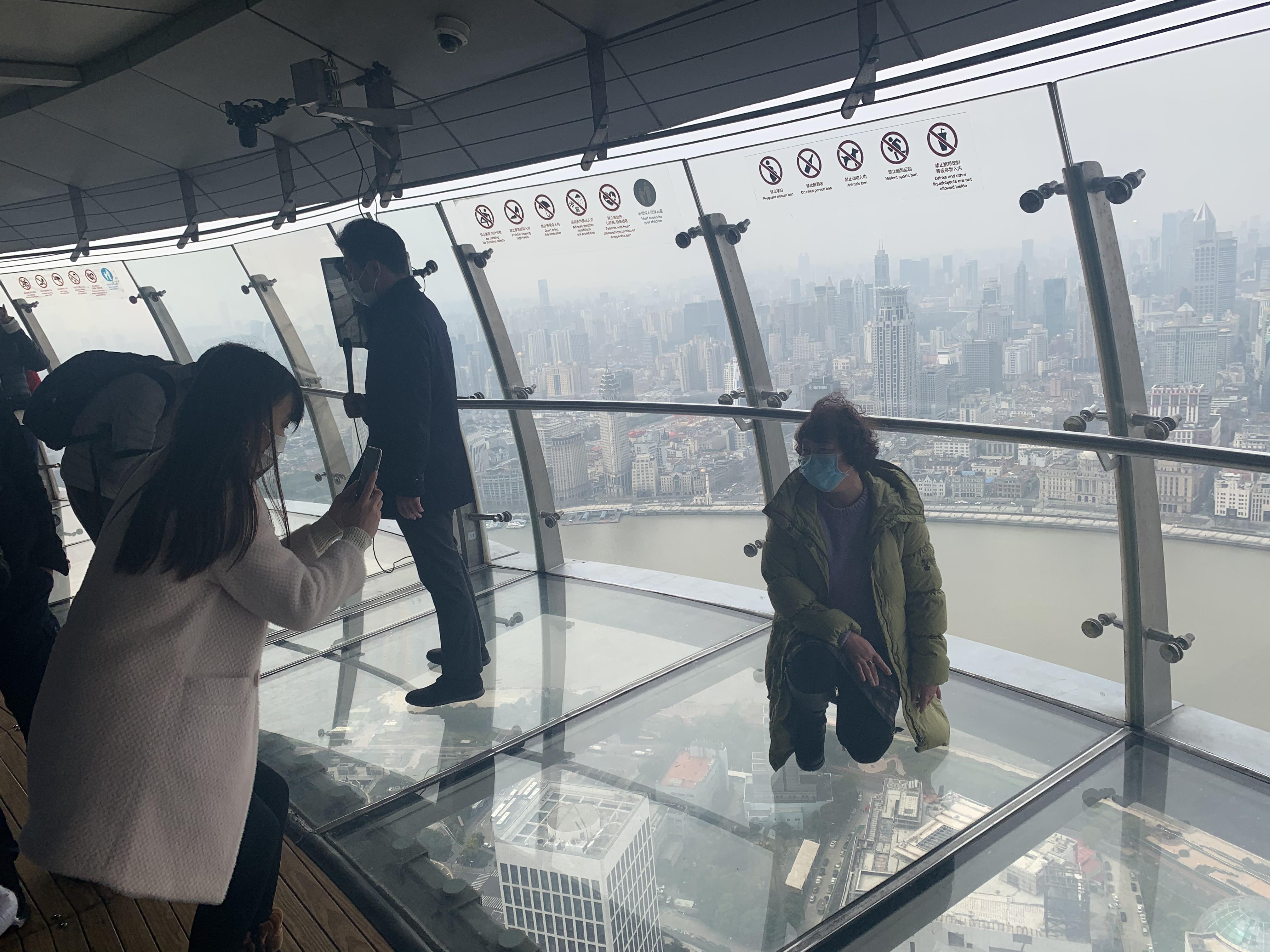 东方明珠恢复开放首日,登塔游客稀少,游客在全透明观光廊独享风光。