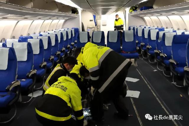 工程师们以最短的时间拆下了连接座椅和飞机地板娱乐系统的导线束,同时对机上保留线束进行了包扎整理,并将剩余导线带下飞机放到指定区域封存。座椅拆卸任务完成后,项目组对剩余的座椅、客舱壁板与过道进行缓冲防震工作,进一步提高客舱座椅的安全可靠性。