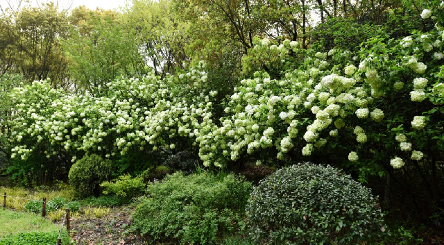 在共青森公园的木绣球园、凤凰林和盈湖岸边,数百余株木绣球赶上百花盛放的节奏,开始在树梢上绽放出美丽的花球,引得游客纷纷驻足观赏。初花期的绣球花多数为绿色,偶尔几朵已变为白色,白绿相间,清新迷人。