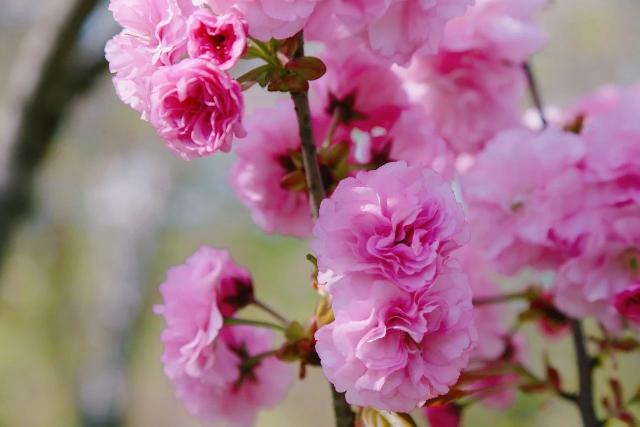 顾村公园里,兰兰、市原虎之尾、郁金等晚樱品种已经进入了观赏期,一朵朵饱满的重瓣花朵,颜色鲜艳,毫不吝啬地展示着自己的美丽。