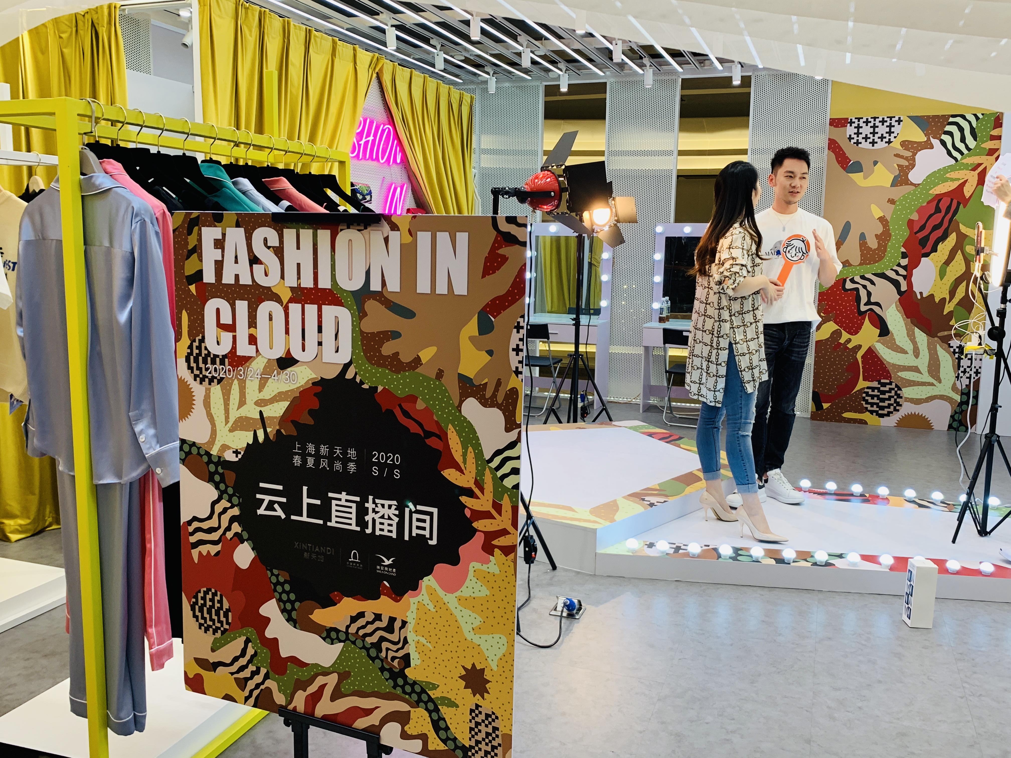 临近晚上7点,商场内的客流略微少了些,而在新天地时尚2楼的一座“小房子”里却是一派“热火朝天”,“门头”上是大大的“XINTIANDI LIVEHOUSE”的灯牌,主播台周边围着灯带,“美颜神器”前架起了3台手机,背景板上,黄色的幕布摆成打开的样子,中间是几个粉色的霓虹英文字——FASHION IN CLOUD。