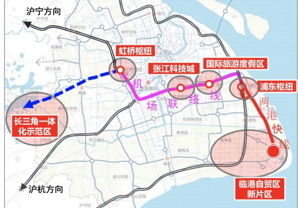 到2035年,加快研究完善并推动轨道交通规划方案落地,包括沪通铁路、沪乍杭铁路和沪舟甬铁路3条国铁;两港快线、轨道交通16号线、轨道交通21号线、曹奉线、奉贤线和南枫线6条总长约100公里的市域铁;以浦东枢纽为主枢纽,四团枢纽等为地区枢纽,市域铁路相关站点等为组团枢纽,围绕组团枢纽布置中运量交通。