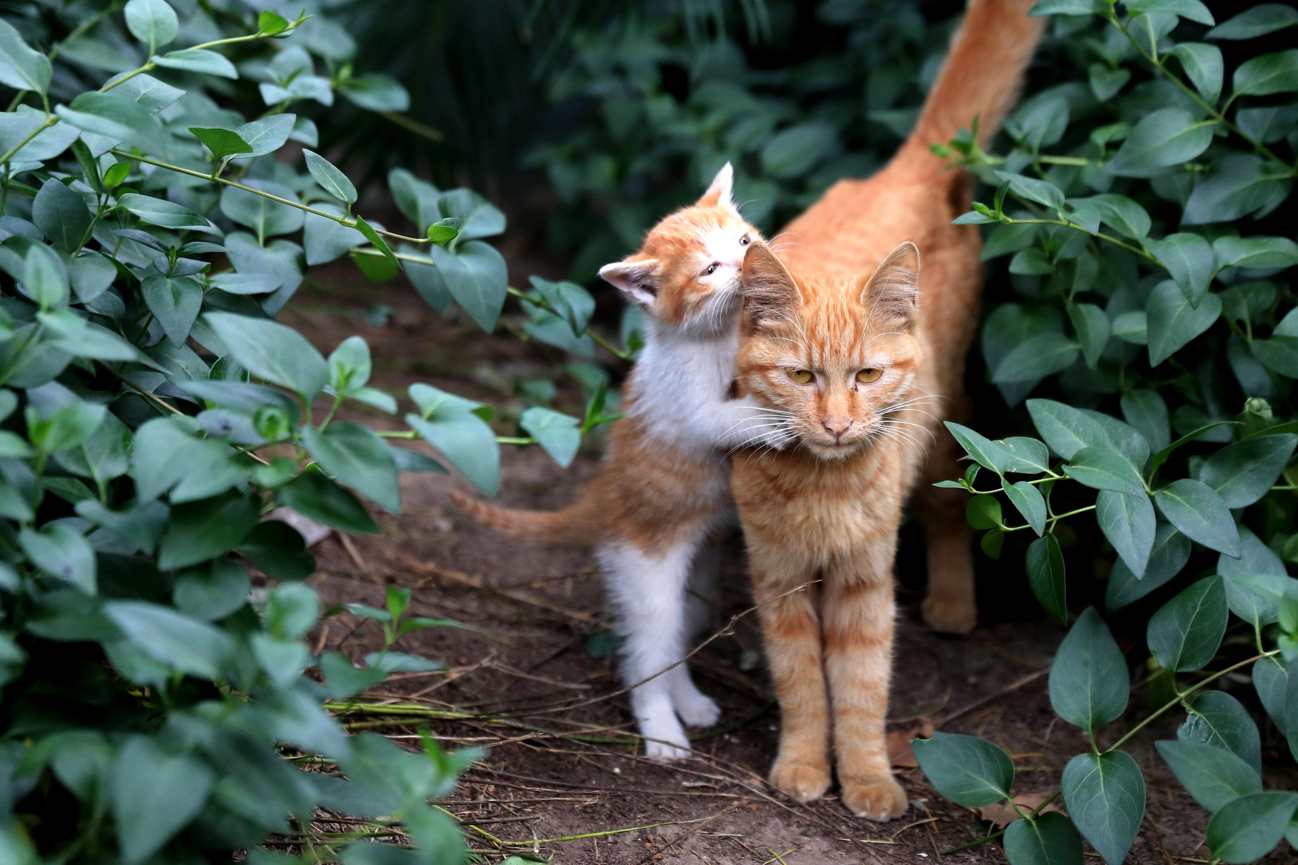 一位经常给它们喂食的女士讲,猫妈妈一个多月前生了四只小猫,三只黄色,一只黑色。前两天有个爱猫的市民领养了一只小黄猫,现在就剩三只小猫了。猫妈妈看上去比较瘦小,但一点不怕人,而是会上来蹭,超可爱。
