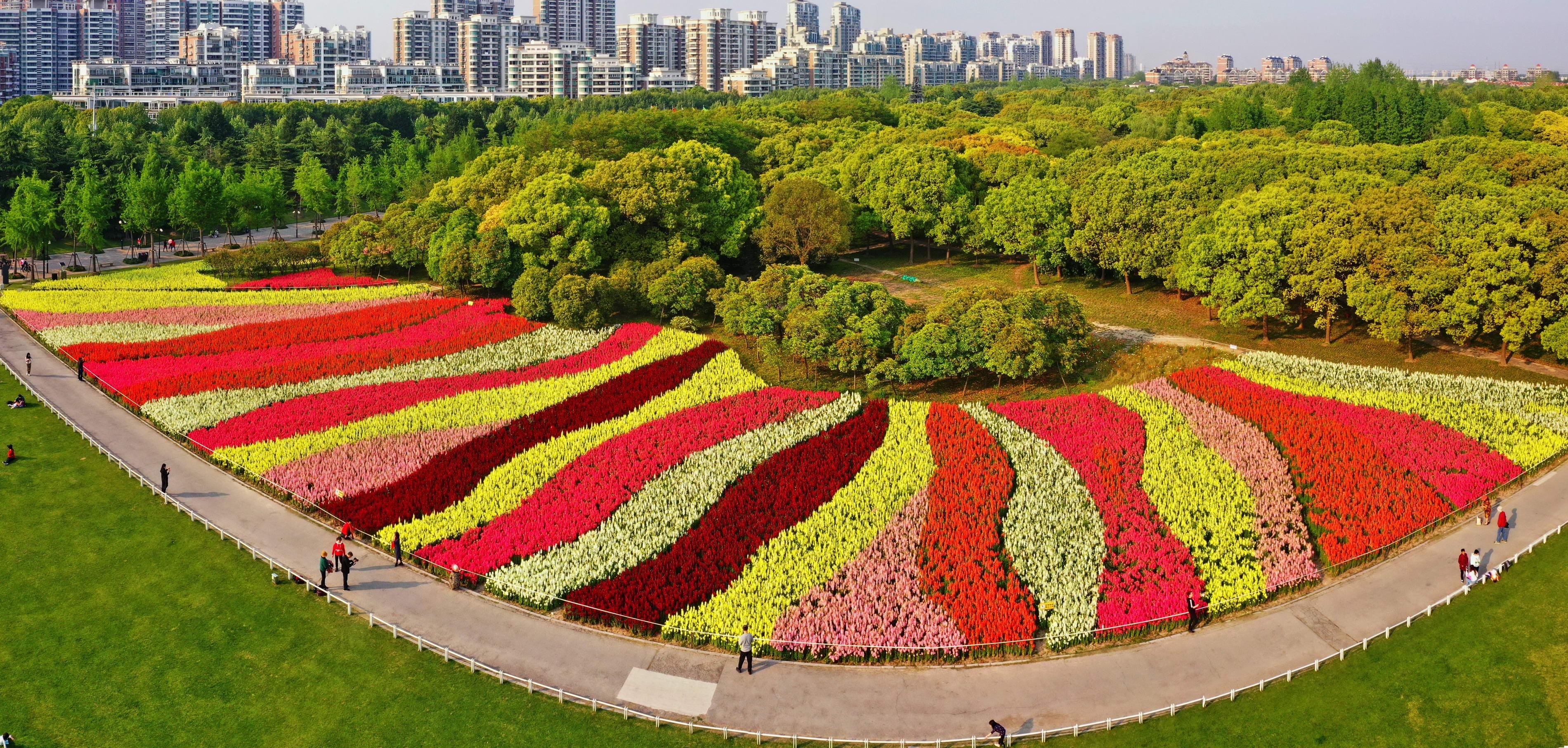 “五一”假期,出门逛公园、赏花应该是很多人的选择之一。世纪公园里,1.5万平方米的花海正在盛开,其中全新升级打造的1万平方米“七彩花田”宛若彩带,航拍更为壮观。
