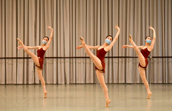 近两个月的时间,全体演员每天早上准时赶到教室,偌大的排练厅里,舞蹈演员们身着练功服,戴着口罩,伴随着悠扬的音乐声响起,相互距离超过2米,不停地做着擦地和下蹲等基本功训练,拉筋、片腿、正踢、侧踢、压高腿、后控腿……热身结束后,在老师的指导下,反复练习规定动作、组合,锻炼肌肉、练习气息。