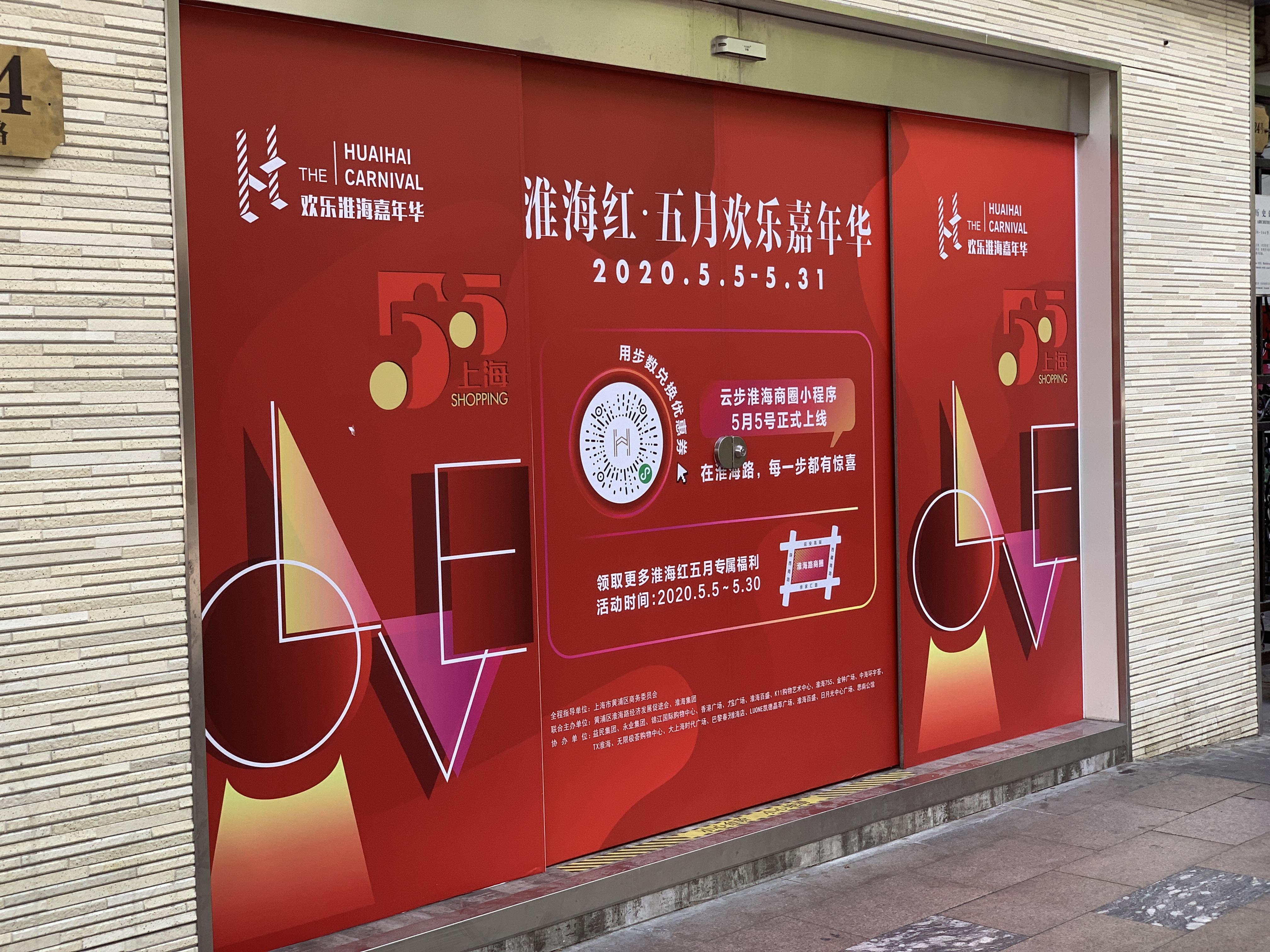 细心的市民会发现,淮海路上多了不少这样红色的“淮海红·五月欢乐嘉年华”宣传牌。市民只需拿起手机扫描宣传牌上的二维码,即可通过小程序累计在淮海路商圈实时行走的步数,用于兑换商圈内各商场及品牌的优惠折扣。