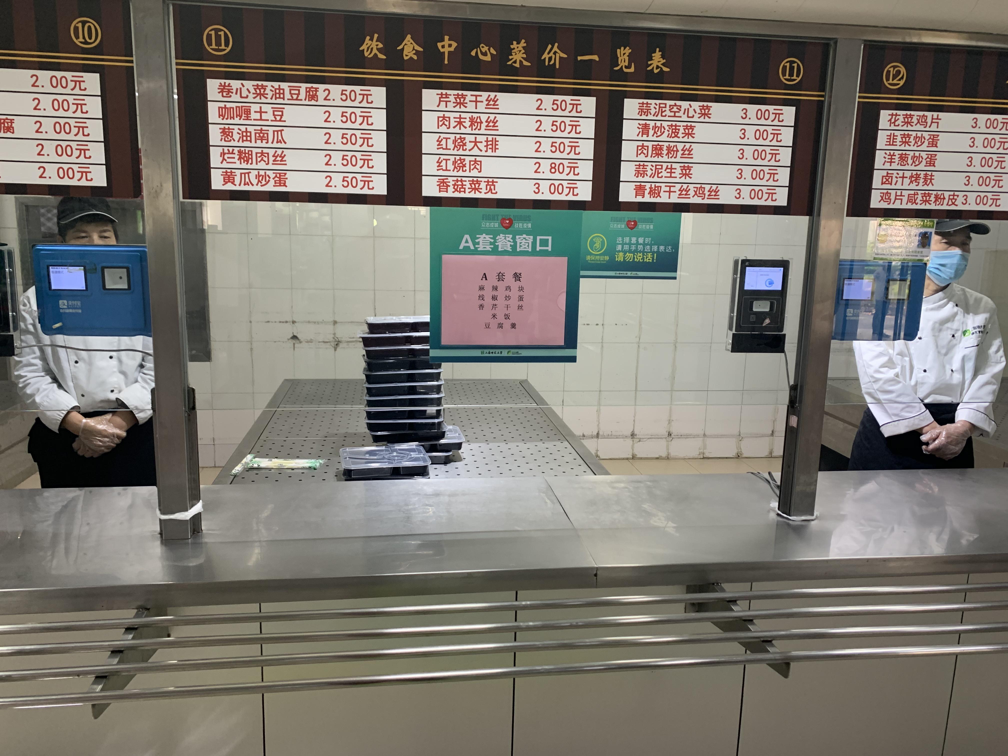 疫情期间为减少人员聚集和接触,食堂仅供应套餐,鼓励师生选择配送到楼和打包,同时兼顾在校师生需求,尽量做到饭菜轻重口味兼具、每餐少重样。
