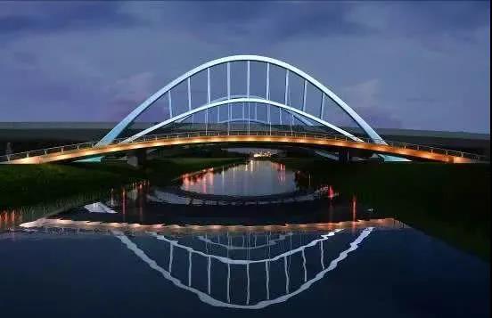 作为进入新城的门户桥梁之一,港俞路淀浦河桥的设计构思独特,以相对较大的弧度跨越淀浦河,丰富了桥梁的立面效果,而两片桥拱犹如张开的雄鹰翅膀,腾跃在水面上。