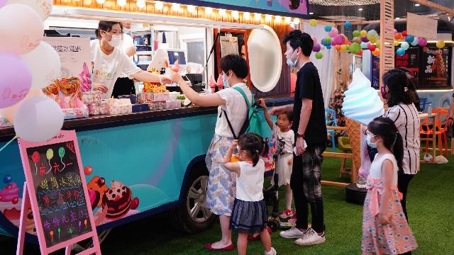 开业当天正值“六一”儿童节,不少商户也推出了优惠活动。这边,疯狂小串满20赠送一瓶冰镇可乐;那边,彩虹甜堂冰淇淋第二个半价,并为小朋友们准备了发夹等小礼物。4岁的蕾蕾跟着外婆从长宁家中赶过来过儿童节,在世界茶饮餐车前,外婆为蕾蕾购买了一杯杨枝甘露,蕾蕾一手接过商家送上来的爱心气球,一手捧着杨枝甘露连连称好喝。