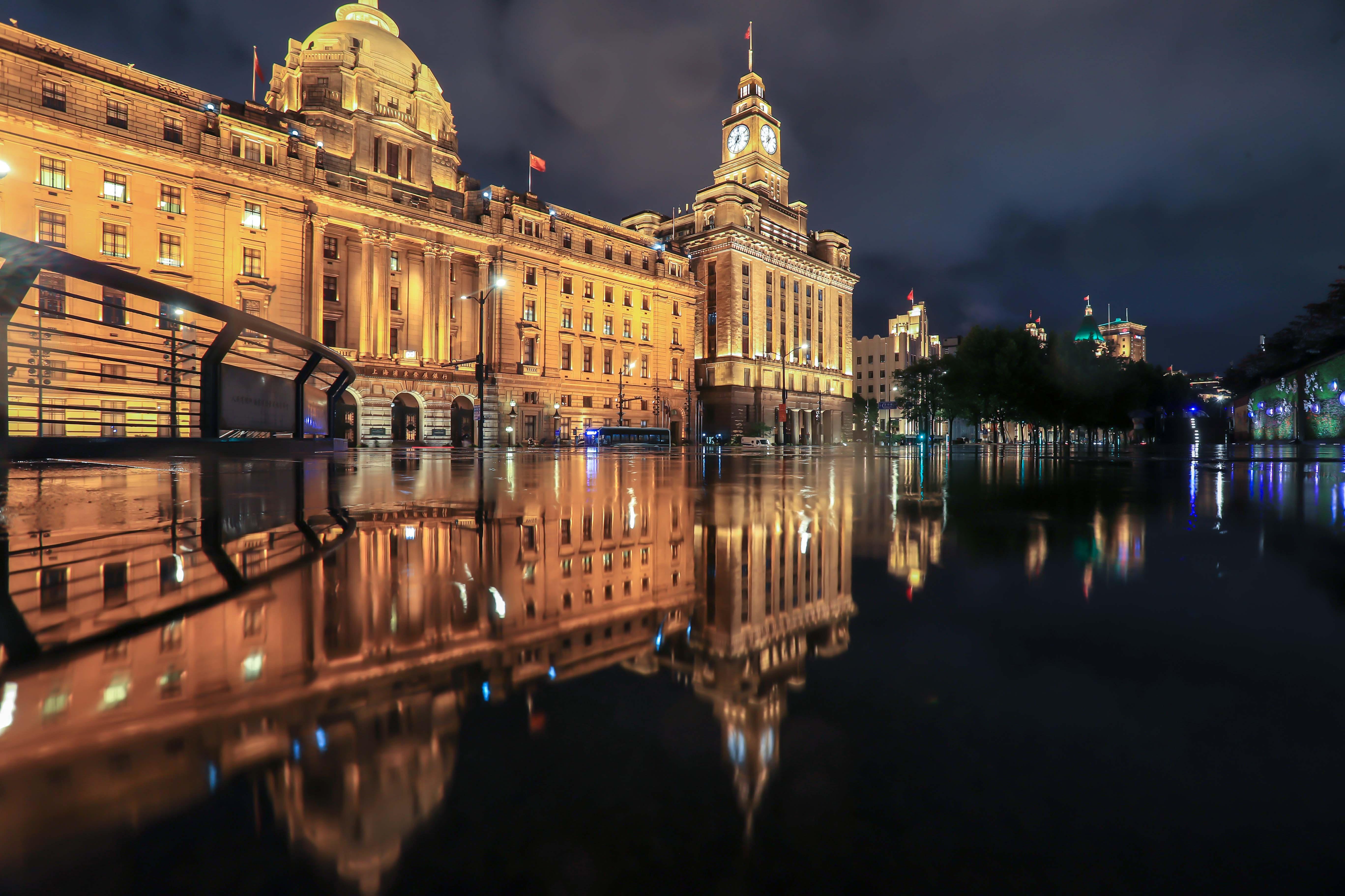 今天上海下了一整天的雨,入夜雨水渐止,浦江两岸的建筑被灯火点亮,通明剔透,而这时外滩观光平台积水变成了“天空之境”!