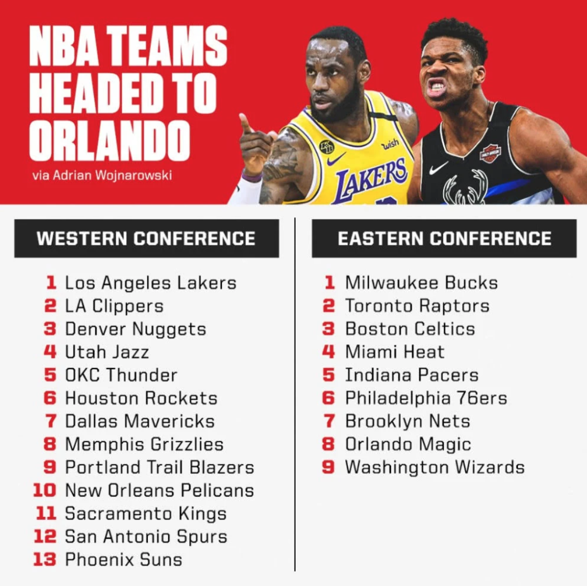 共有22支球队参与本次复赛,他们是:目前西部前八,湖人,快船,掘金,爵士,雷霆,火箭,独行侠,灰熊;东部前八,雄鹿,猛龙,凯尔特人,热火,步行者,76人,篮网,以及其他有资格争夺季后赛名额球队,开拓者,鹈鹕,国王,马刺,太阳,奇才。