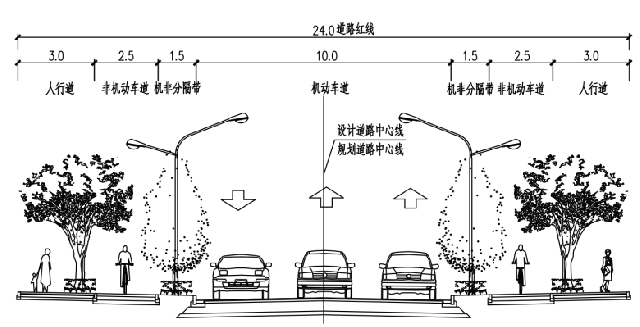 横断面布置:南曹路(中心河-华东路)横断面为2.5m(人行道)+2.0m(绿化带)+15.0m(车行道)+2.0m(绿化带)+2.5m(人行道)=24.0m。