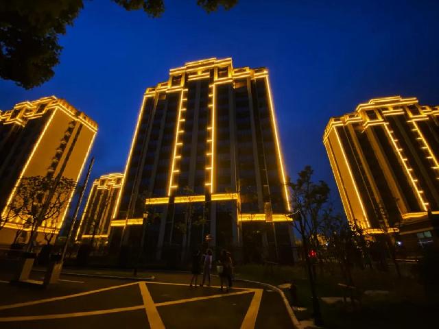 虽然小区还未开放,但从外围可以看到外立面和配套建设已经基本完成,绿化小品也已完工,正门处配有门禁系统。小区淡黄色的外立面上沿着外围镶着灯带,等到夜晚,夜色下明亮大气,吸引了不少居民散步时驻足拍照。