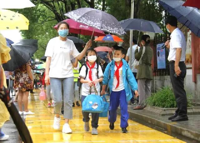 “从赵非公路这个路口到学校大门口,这条新划出来的步道上,任何车辆都不可以通行,让小伙伴之间既能前后相隔间距一米,又能安全放心地多走一段上学路。”邹艺伟说,像今天早上这样的雨天,对于家长开车接送的学生,当天值日的护导老师早早等在路口处,帮助孩子尽快下车,撑伞遮挡。自带雨具的学生撑好雨伞,或穿好雨衣,告别家长,背着书包,沿着“金色步道”自行走这一段上学路,进入校园,并没有淋湿。