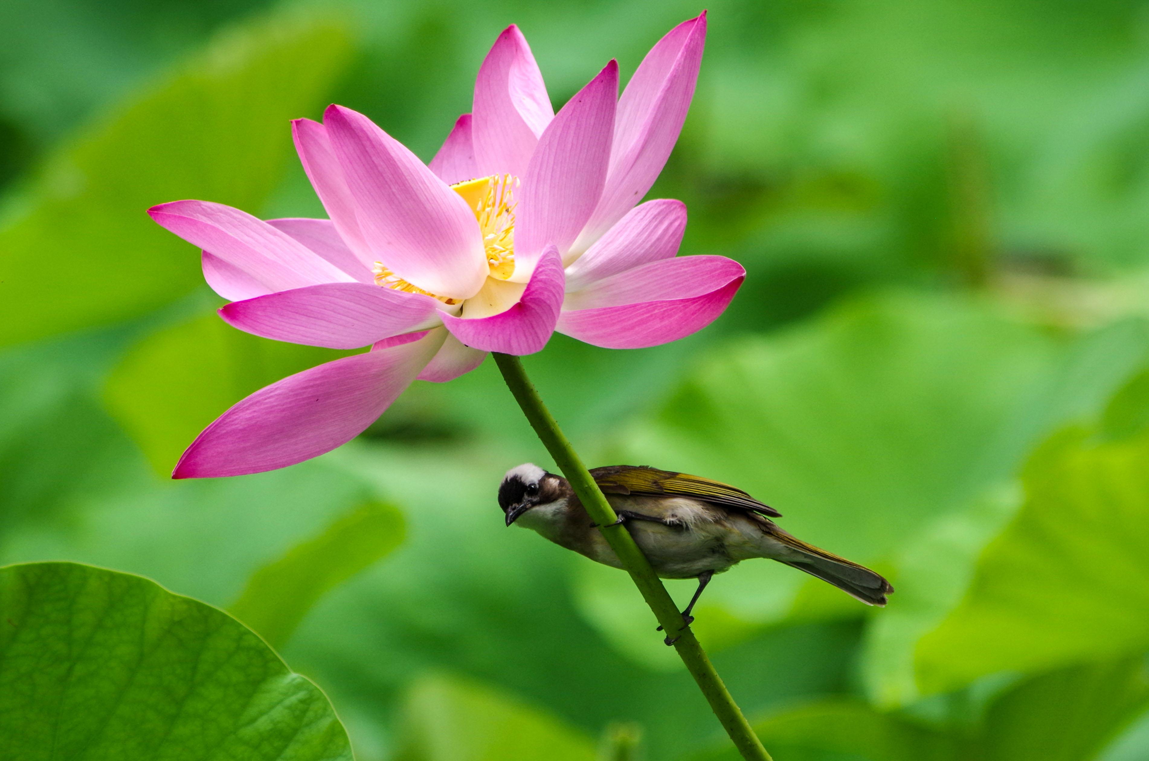 最有趣的是白头翁叽叽喳喳在莲叶间飞来飞去嬉戏觅食,鸟儿们的每一个动作都会引来塘边慑友们〝咔嚓.咔嚓〝的快门声。