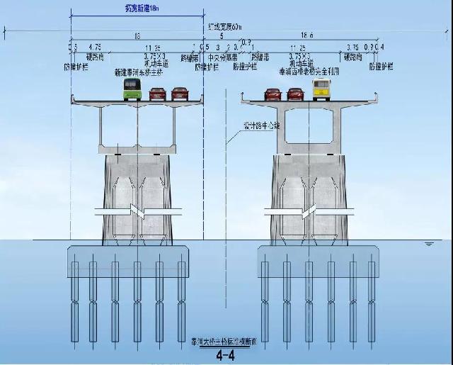 为满足越江交通需求,该工程将现状S4公路(颛桥主线收费站南侧~西闸公路以南)双向4车道拓宽为双向6车道,两侧设置紧急停车带,设计车速为主线100km/h,匝道40km/h。其中新建奉浦东桥,单向3车道 紧急停车带,与现状奉浦大桥组成双向6车道规模大桥。