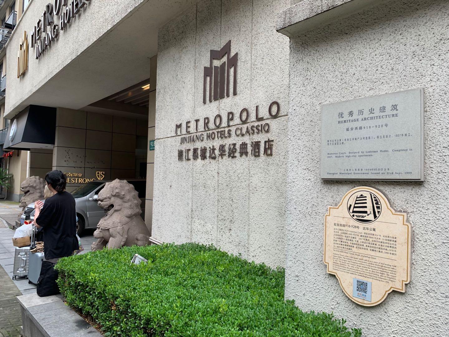 酒店坐落在延安西路918—928号。在酒店外墙,挂着上海市优秀历史建筑的铭牌,扫描二维码即可阅读老建筑的前世今生。走进酒店,迎面就是一面邬达克的铜牌,显示着他与这所酒店的深厚渊源。