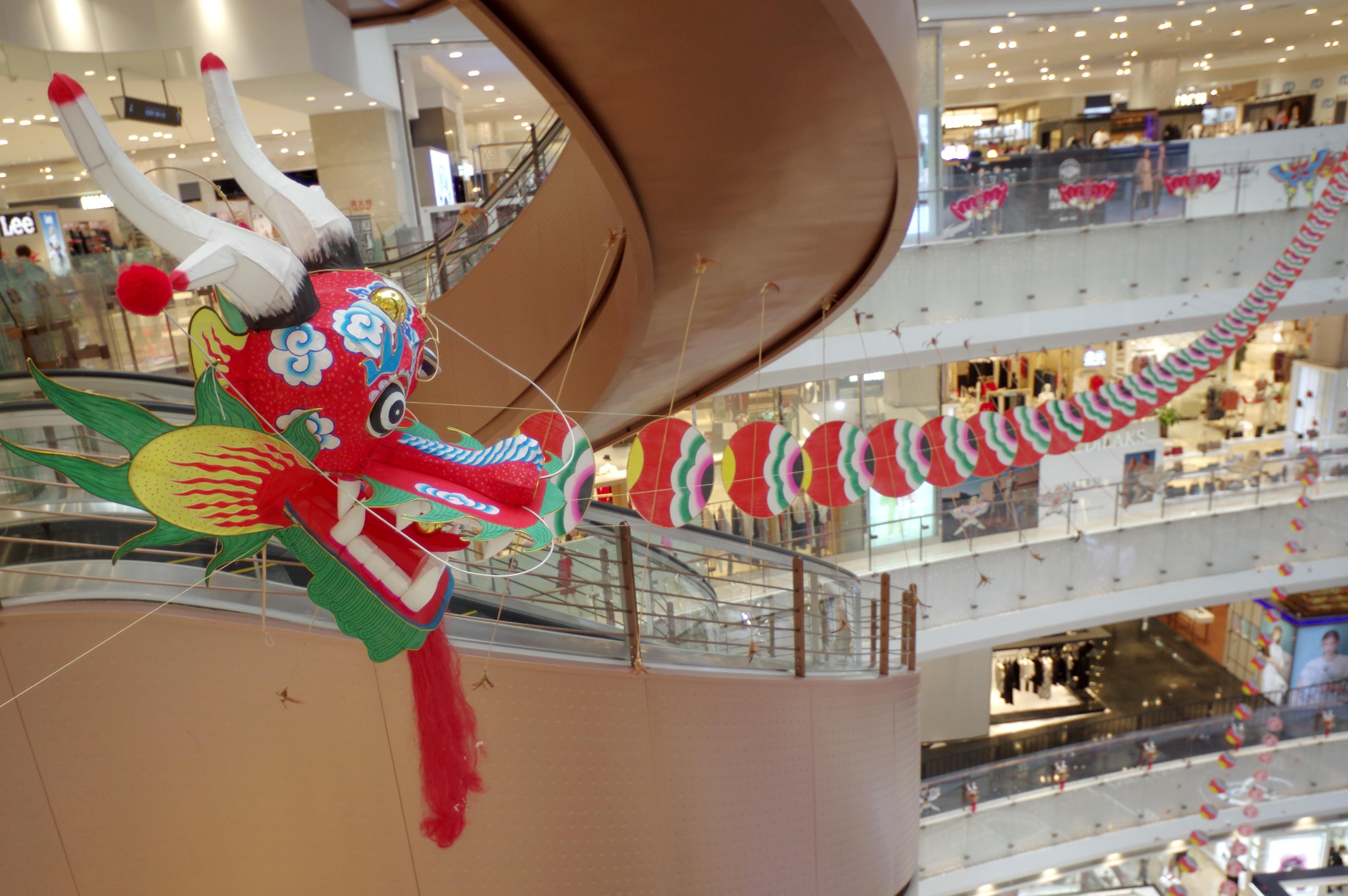 端午佳节,南京路新世界大丸百货大厅悬挂着六条长长的彩龙风筝,三林舞龙队为游客带来精彩的舞龙舞狮表演,市民和游客也饶有兴趣地龙舟打卡、龙狮体验。