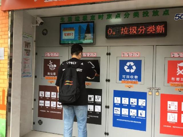 为方便居民做垃圾分类,新的垃圾箱房还利用5G高速网络通过AI摄像头智能识别指定时间外的违规投放行为,并予以语音提示,建议市民前往别处扔垃圾。