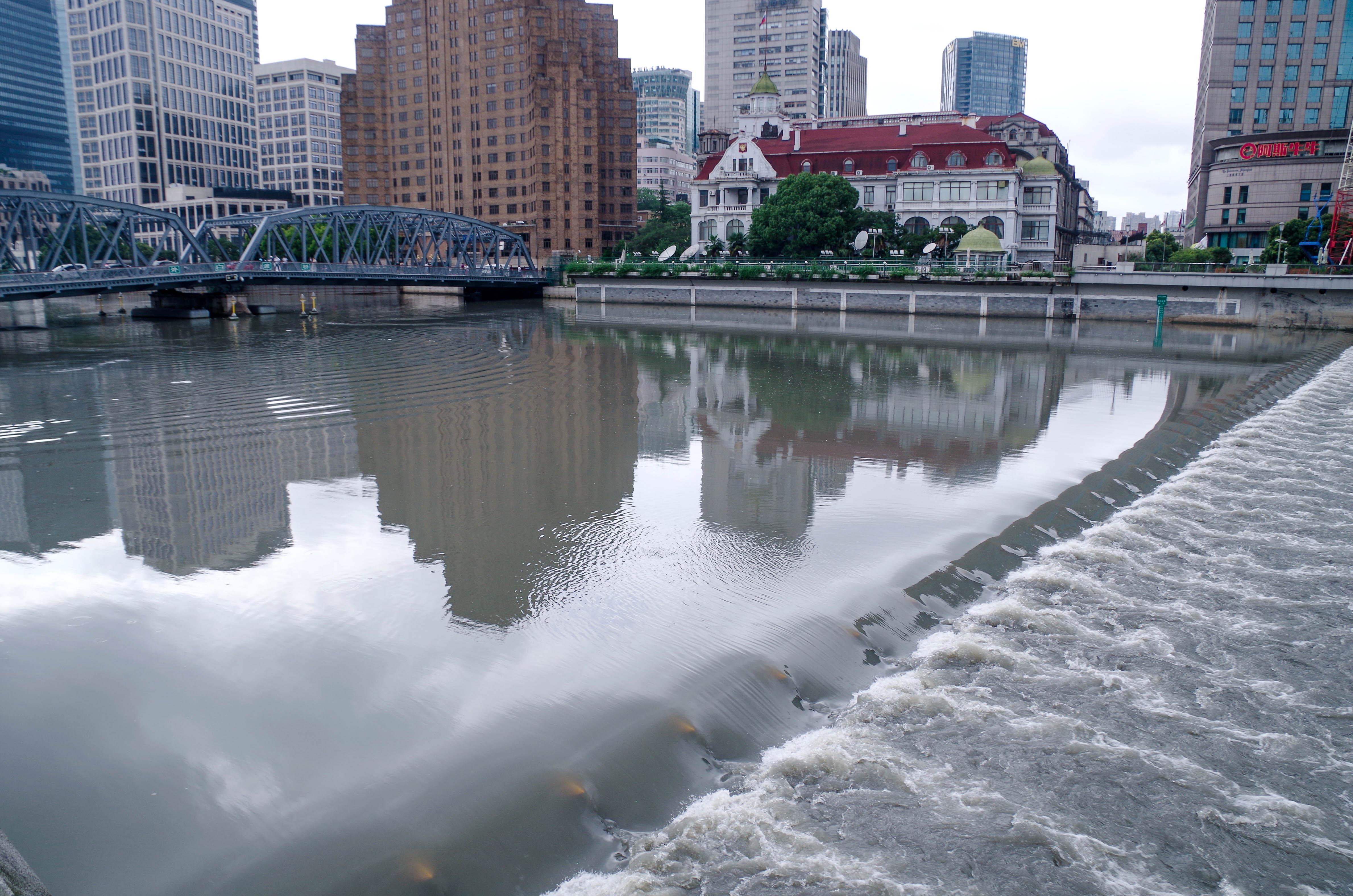 记者发现,今天的苏州河水位明显高于黄浦江水位,水面下的翻起的闸门与河面齐平,河水从闸门顶溢出倾泻到黄浦江里,形成了一道“小瀑布”。河水落差虽然不是很大,但那河水跃过水闸之时,白浪翻滚,涛声轰鸣,甚是壮观。