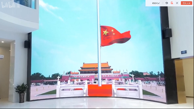 一进入国旗教育馆的序厅,巨幅LED屏映入眼帘。镜头前后,师生党员共同参加了一场室内升国旗仪式。奏唱国歌时,侧墙上的国歌歌词相应亮起,国旗与国歌交相辉映。在屏幕之外,全国各地的师生党员在家中面对国旗庄严肃立,高唱国歌。