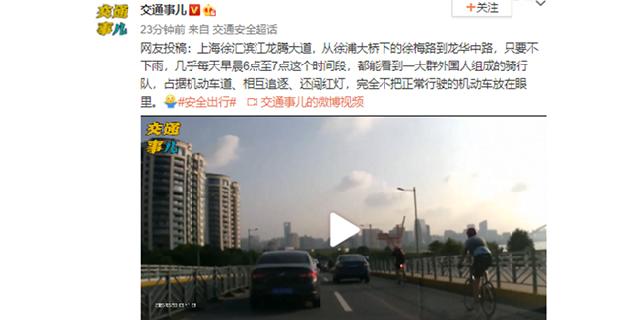 事情的起因是这样的,近日,微博公众号“交通事儿”称:上海徐汇滨江龙腾大道,从徐浦大桥下的徐梅路到龙华中路,只要不下雨,几乎每天早晨6点至7点都能看到一大群外国人组成的骑行队,占据机动车道,相互追逐、闯红灯,不把正常行驶的机动车放在眼里。