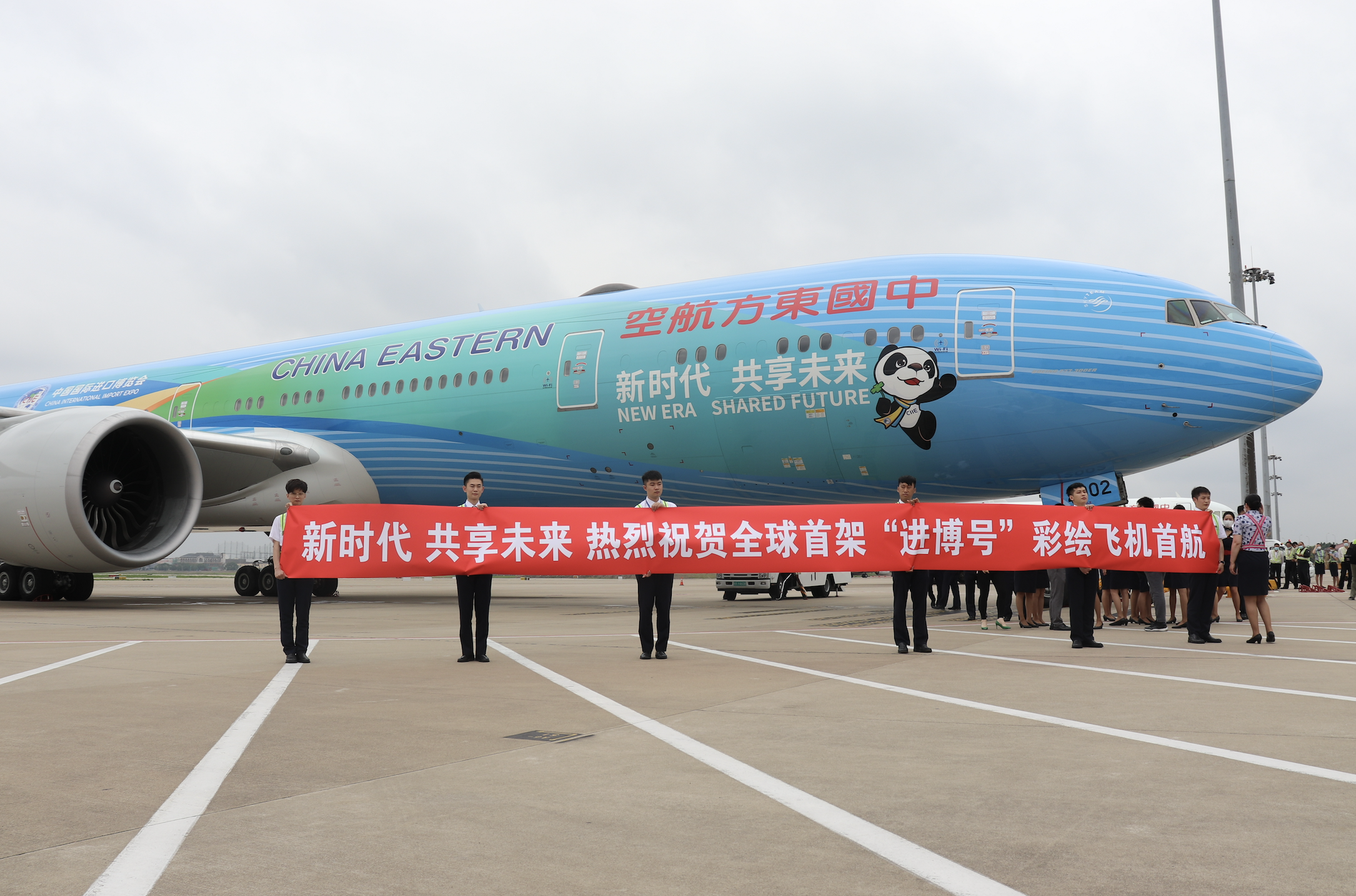 “进博号”彩绘飞机采用的是东航目前载客量最大、航程最远的国际远程旗舰宽体机波音777-300ER,这也是东航该机型的首架彩绘机。