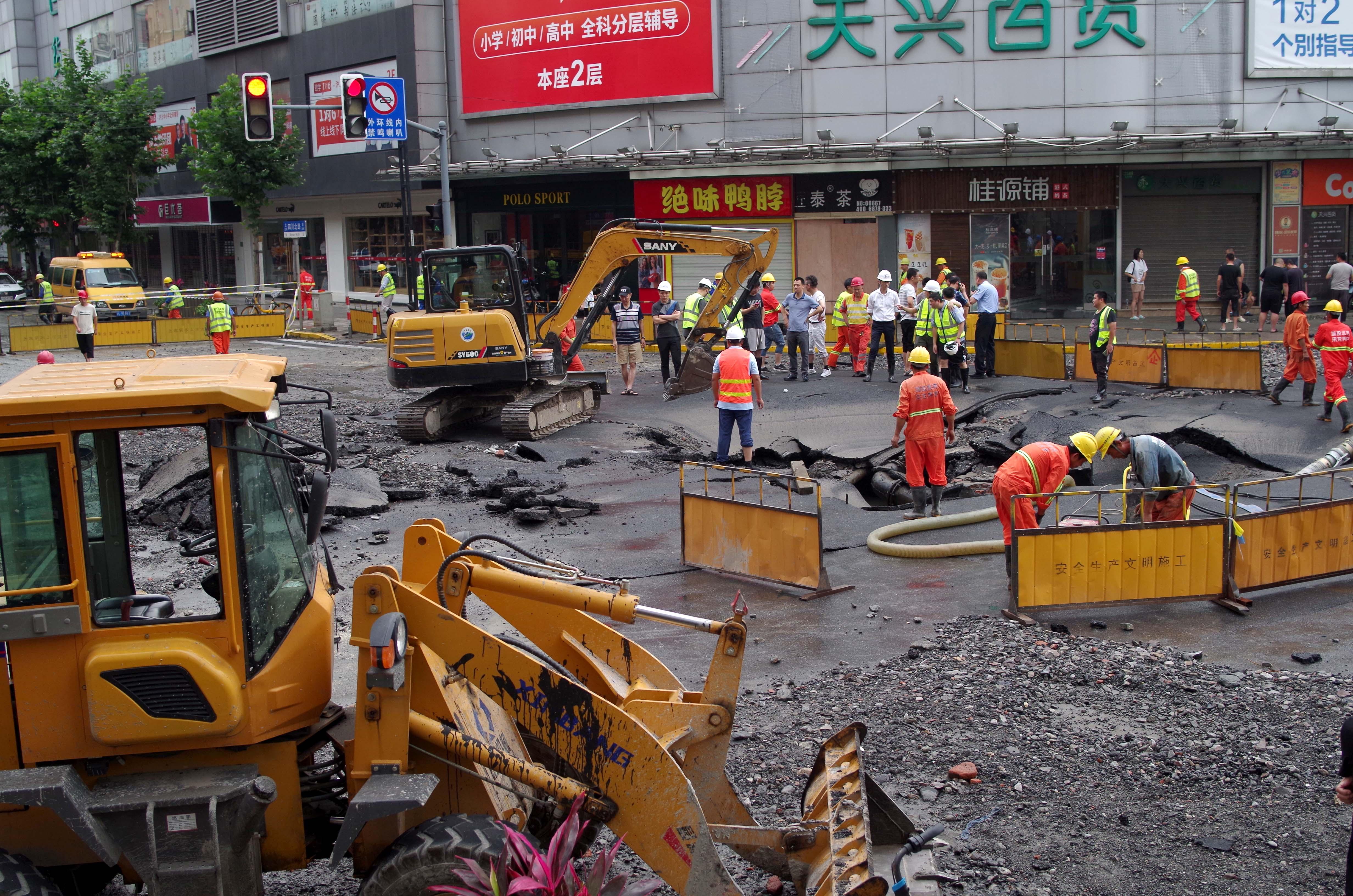 7月13日清晨5:30,记者接到报料:四川北路东江湾路疑似水管爆裂,大水漫过上街沿。记者5:40赶到现场,大水已经退去,多辆黄色的抢险车在作业。记者沿着泥泞的上街沿走到四川北路东江湾路口的事故现场,天兴百货门前的马路上有一个大坑,路面最表面的沥青层断裂翘起,抢险人员正在现场抽水,大坑里露出各种管道。