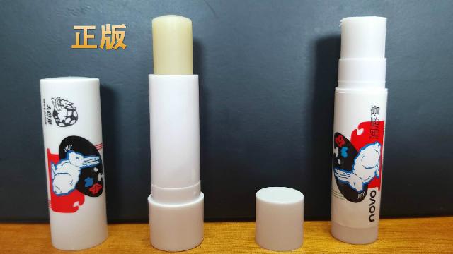 这种水果奶糖味的“大白兔唇膏”管身比正版的细、短,且管身上的图形字样都是由一层粘纸贴上去的。拧开后,膏体雪白,不像正版是淡淡的柔和的黄白色。