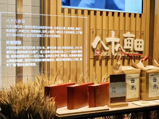 以“松江大米”为主要元素的展台十分吸睛。米穗包围着主展区,八十八亩田的品牌LOGO与介绍在木质柜台尤为显著,牛皮纸袋与红色包装等不同规格的松江大米与叶榭软糕置于中央,大屏幕正播放着大米与软糕的宣传视频,画面令人馋言欲滴。