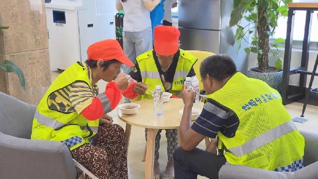 有几位环卫工人趁着工作间隙走进了爱心接力站,他们一坐下来,就有工作人员为他们送上了自制的绿豆汤。张阿婆是这里的常客,她笑着告诉记者,“以前我们在大热天只能到树荫下躲一躲,有了这个爱心接力站后,我们就能在空调间里休息一会儿,还有绿豆汤喝,有冰棍吃。”