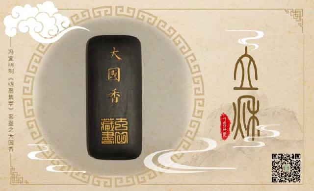 本期题图中的墨品,是徽墨艺人冯宜明先生所制《明墨集萃》中的一笏“大国香”。历史上传承下来的墨品中,冠以香名的墨有许多,如“龙香剂”、“菊香膏”、“ 麝香月”、“苏合香墨”、“寒香”、“京香墨”等等。不仅是名字里有香,制墨原料中也确实需要掺入香药。据宋李孝美著《墨谱法式》卷下“叙药”中录有:甘松、藿香、零陵香、白檀、丁香、龙脑、麝香、郁金、丹皮、芸香等,都是传统的和香用香药。