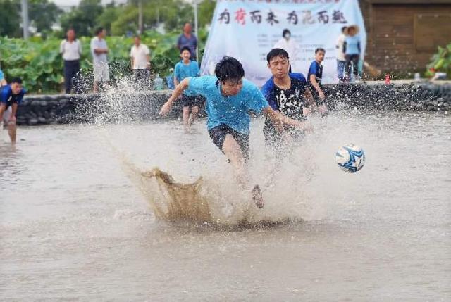 随着一声哨响,参加比赛的四支队伍分成两组同时跳下水开始比赛。四溅的泥水中,足球格外“调皮”,球员们因为追球常常一起摔倒在泥潭里,看得岸上的观众忍俊不禁。第一次参赛的叶榭安谱实验队一时难以适应泥地,被种子队伍新浜超进化联队连进三球,遗憾淘汰。而另一边方松队与石湖荡F5则势均力敌,在40分钟的比赛中僵持不下,4轮点球也仍未决出胜负,最终两队以石头剪刀布的方式决出了胜者。