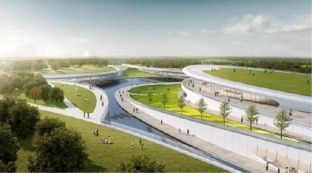 桃浦中央绿地总体设计融合了中国传统书法、舞蹈和太极艺术的优美动势,通过打造绿地内延绵起伏的地形和蜿蜒动态的园路水系,形成一个连续变化、层叠展开的山水长卷和 “行云流水”的动态空间。中央绿地地势北高南低,从北向南逐渐由北三块的自然休憩山谷林地,过渡到南三块的绿色地下商业文化空间,而北拓区域则侧重营造在城市森林中融入青少年户外活动空间。