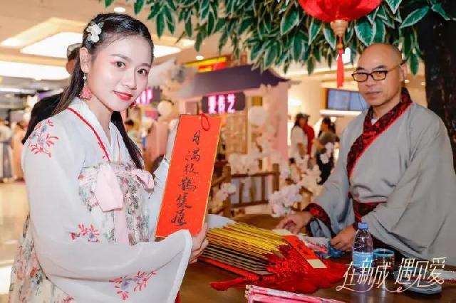 七夕节是中国人的“情人节”,爱是节日的主题。19点刚过,穿着汉服的姑娘和现场配对的小伙一起走进古代街市,一边体验着剪纸等传统文化,一边互相了解、“谈情说爱”。丰盛的文化夜宴,不仅让现场大龄青年感受了更多浪漫气氛,也为传统“相亲”文化注入了新的活力。