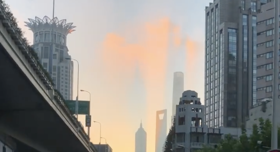 从视频中,可以看见天边出现了金红色的霞光,而霞光之上依稀有一些高楼建筑般的影子,地面有高楼,天上仿佛也有“高楼”。