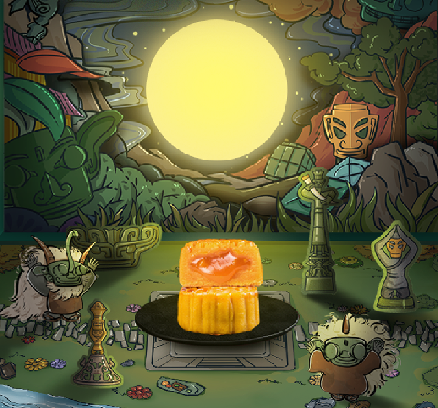 月饼饼身饰以古人赏月的画面,内里有杨枝甘露芒果流心、龙井茶丹桂流心、奶黄流心、蔓越莓、粒粒红豆桃山皮、软心蜜桃乌龙茶、蛋黄莲蓉、台式凤梨8个口味。