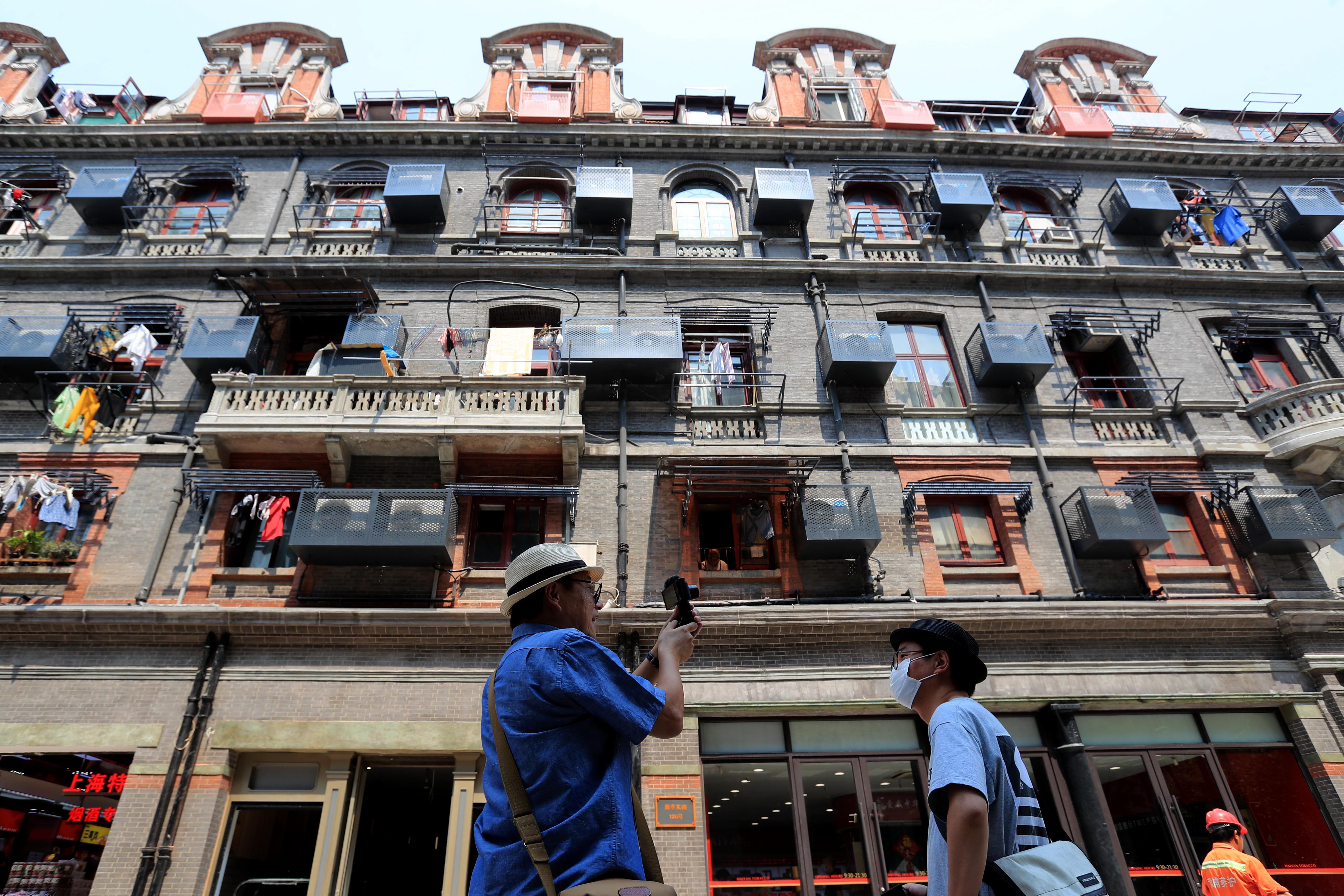 9月7日下午,南京路步行街东拓段慈安里大楼外立面空调室外机罩安装基本完成,工人们在升降机上加紧为居民安装晾衣架。