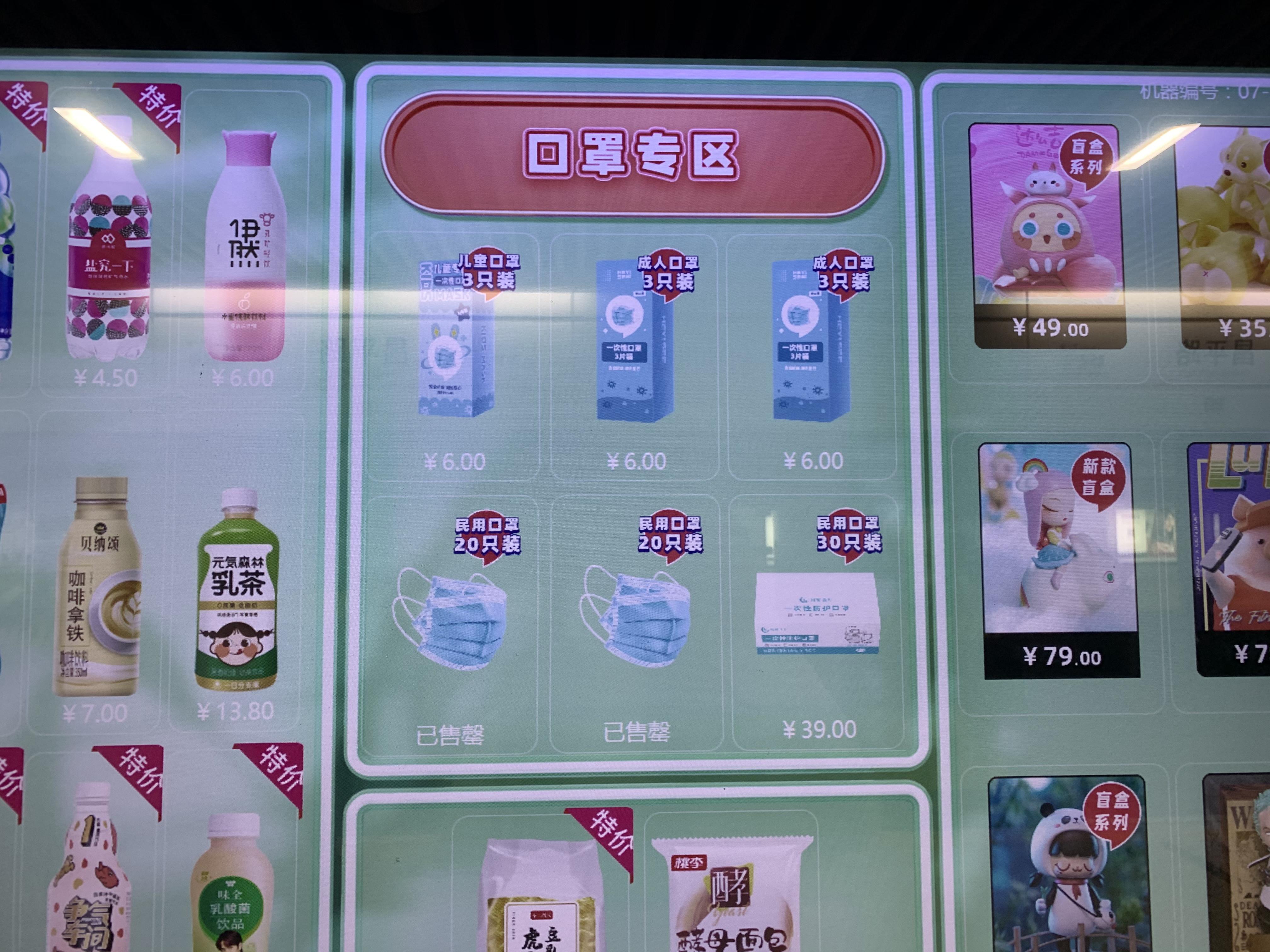 售卖机上的口罩专区显示有货的有三个类型的口罩,分别是6元3只的儿童口罩、6元3只的成人口罩和39元30只的民用口罩。而20只装的民用口罩显示“已售罄”。