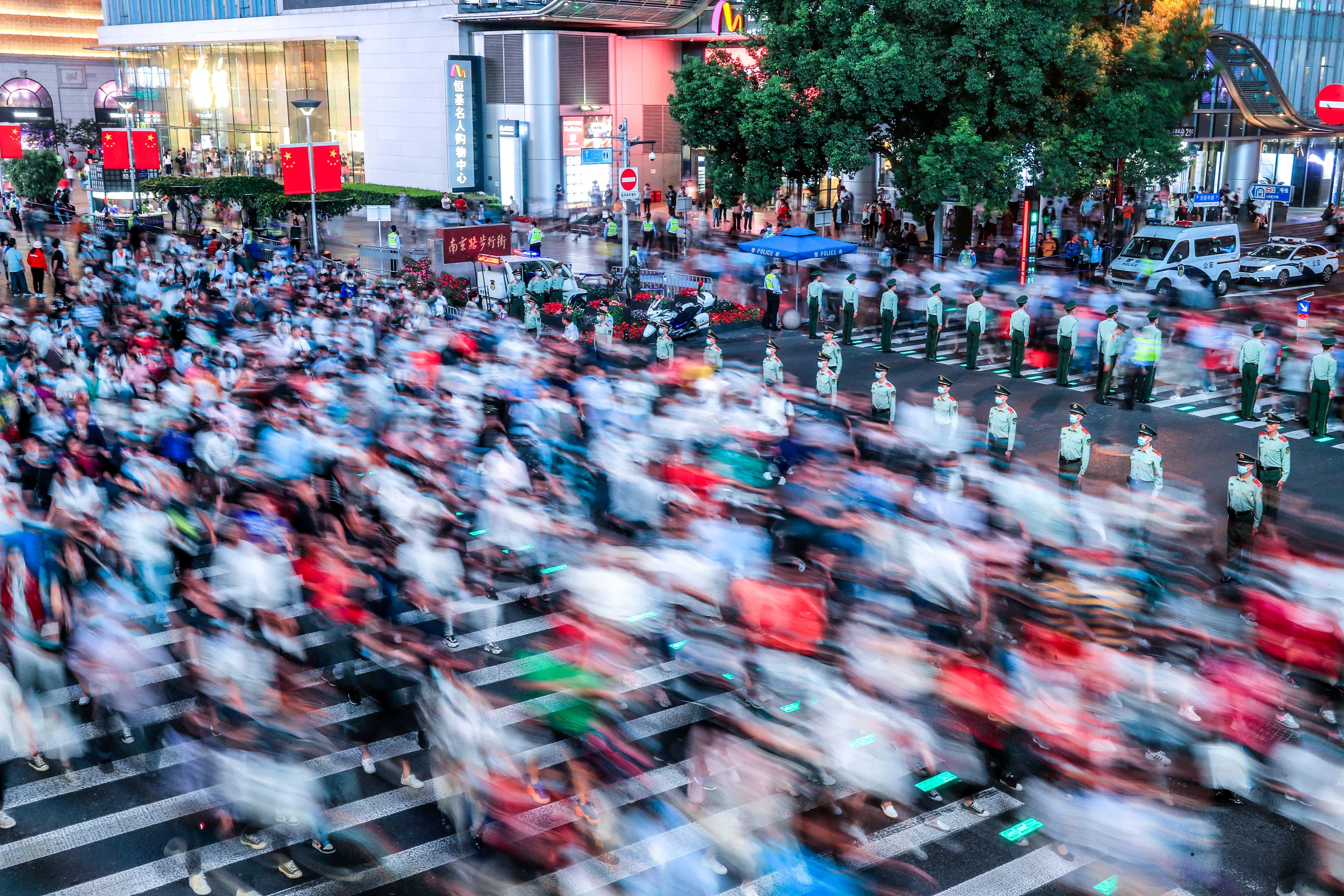 9月30日6时许,华灯初上,南京路步行街上赏灯的游人从四面八方向外滩流动,黄浦警方采取 " 南进北出" 等管控引导观灯人流。河南中路口数十名武警在路口组成“拉链式人墙”,随着红绿灯的变化而“开关”,确保游客出行安全。