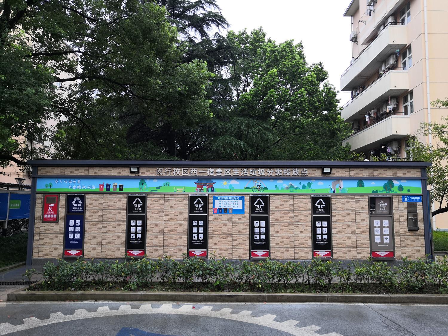 上海交通大学的教学楼里,干、湿垃圾、可回收物的桶摆放在大家最顺手的位置;食堂里,老师新生餐后主动分拣干湿垃圾;校园内还特别定制了“高配置”的垃圾箱房。