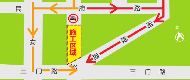 路径1:淞沪路-民府路(殷高东路、国舟路)-国安路-三门路-淞沪路进行绕行。