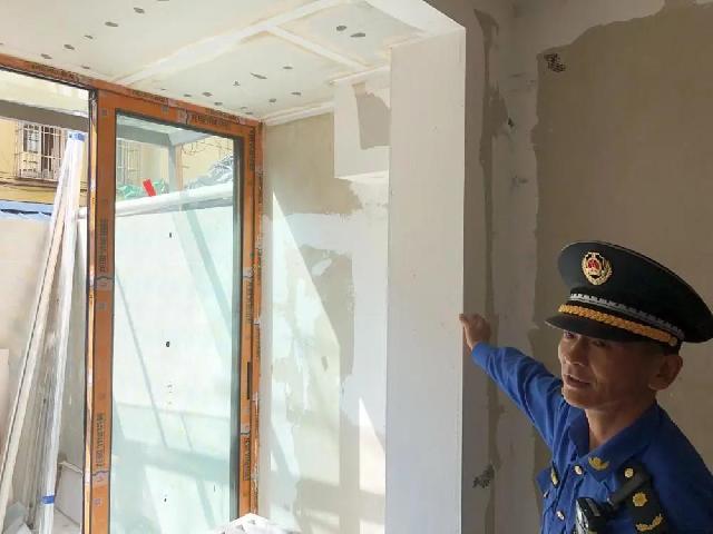 9月22日,城管部门就已接到过邻居的投诉,称101室敲除了承重墙。执法人员上门检查发现,敲除的正是阳台和房间分隔处的墙体承重柱。