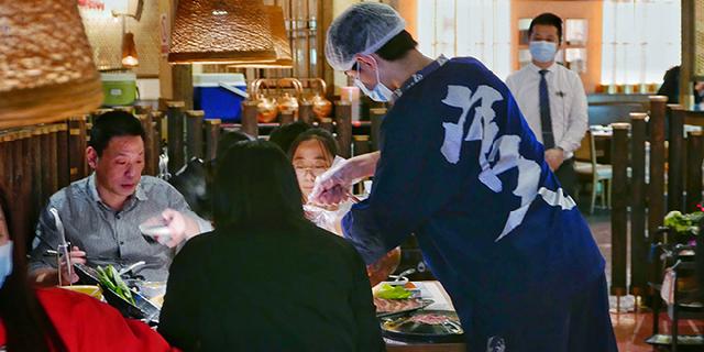 同样在佩戴了一次性帽子后,记者来到了后厨,切肉、炸年糕、煮牛蛙……所有店员们有序地准备着食材,分别将准备好的食材放进不锈钢盆以及塑料盆,再由其他员工分配至各个菜盘,这些食材大部分是提供给堂食的顾客,但是也有少部分食材经过层层包装,提供给点了外卖的顾客。
